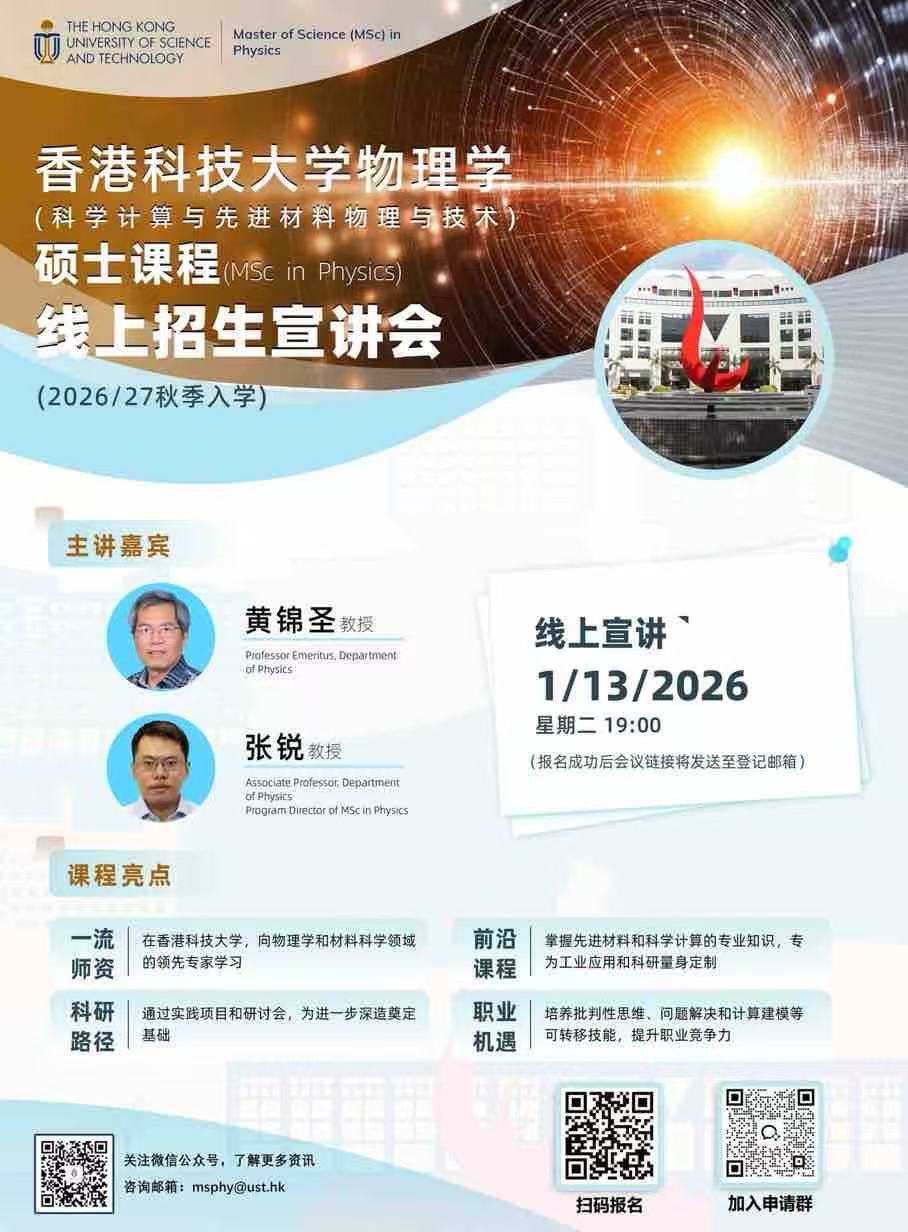 1. 香港科技大学物理学(科学计算与先进材料物理与技术)理学硕士线上招生宣讲会